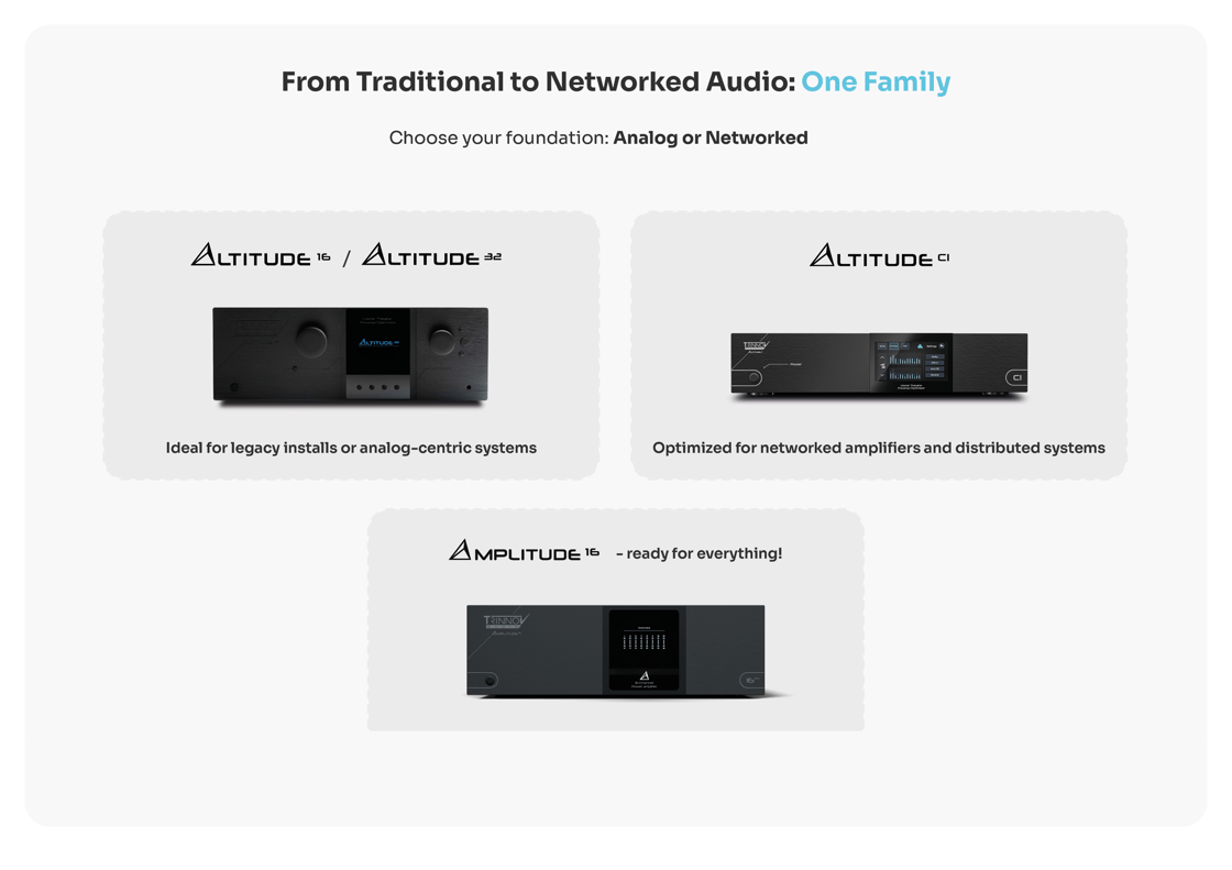 - Media Rooms & Hi-Fi (Stereo to 7.1.4)Both Altitude16 and AltitudeCI can serve these projects, but in different ways. The Altitude16 is the natural fit when paired with analog amplifiers. The AltitudeCI, available as an 8-channel configuration, is particularly efficient for smaller systems such as stereo, 5.1, or 7.1, avoiding unused channels while adding AoIP flexibility. It becomes even more compelling when digital-input amplifiers are part of the design.